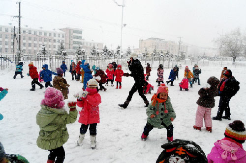 连日来的降雪,把八五五农场这座小城装扮的分外妖娆,仿佛一切都置身在银装素裹的世界里,大雪过后,这个农场幼儿园的孩子们在老师带领下,纷纷走出户外,堆雪人、打雪仗,尽情享受着雪后的欢乐。