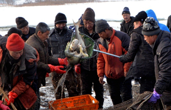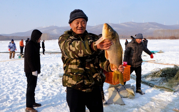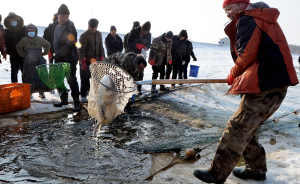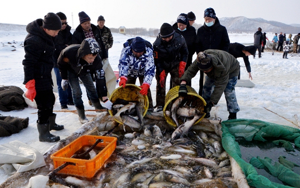 凿冰眼,下冬网,捕鲜鱼,这是勤得利农场有限公司每年上演的冬捕大戏。一大早,三八水库打鱼人冒着严寒选好下网地点,在将近1米厚的冰层上凿出一个冰口子来,开凿的第一个冰眼为下网眼。再由下网眼向两侧每隔八九米凿一个冰眼,几百米长的渔网自下网眼进入冰面以下后,便沿着这些冰眼在冰下“行走”,慢慢舒展成一个硕大的“包围圈”。随着机车牵引网绳慢慢转动,渔网被一点点拉出,鲤鱼、鲫鱼、鲢鱼、草鱼、鲶鱼、鳌花等鱼在网中打着滚、撒着欢跃上冰面,前来观看捕鱼的人们也都一拥而上,拿出手机、相机记录着这一壮观的场面。